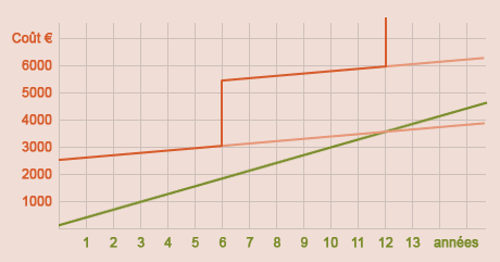 Comparaison, dans le temps, des coûts entre l'abonnement à un site internet à 25 euros / mois (tracé vert) et un autre développé sur-mesure à 2500 euros et 90 euros / an d'hébergement (tracé orange). Les deux droites se coupent après 12 ans. Notez que 2500 euros représente un coût minimal pour la création d'un site internet, et non un coût moyen. Le tracé orange ne prend pas en compte les frais supplémentaires liés à des interventions régulières (ajout de fonctionnalités, correction de problèmes techniques, etc.). Le décrochage de la ligne orange lors des 6e et 12e années correspond à une refonte du site internet : la durée moyenne d'un site internet est généralement de 2 à 3 ans, toutefois, dans le milieu associatif et d'après nos observations, cette durée varie plutôt de 3 à 6 ans.